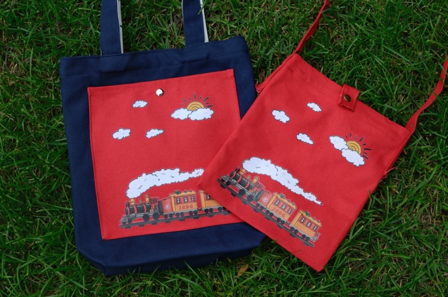 铁路在我国发展上有着不可替代的功劳。我们借鉴铁路的素材,以“回家”为主题,使用古老的蒸汽机车为主体,设计出这幅图案。我们协同供应商,在技术足够的前提下,使用红蓝撞色的主包、外包设计,制作出这样一款帆布包。图案的主体是蒸汽机车,2019年火车头奖章获得者刘志明教授指正了图案中蒸汽机车的结构,保证其结构的无误。蒸汽机车的部分设计融入了民族传统元素,看起来传统亲切,也表现出铁路建设发展促进了我国各民族的大团结的含义。